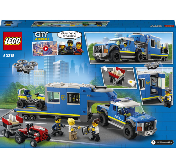 • Policejní sada na motivy seriálu z prostředí LEGO® City – Sada Mobilní velitelský vůz policie (60315) od LEGO City je doslova nabitá inspirací. Určeno dětem a fanouškům seriálu LEGO City Dobrodružství • Co se ukrývá v krabici? – Vše, co děti potřebují k sestavení policejního pick-upu, přívěsu s celou, dronu, čtyřkolky a traktoru s přívěsem, a k tomu navíc 4 minifigurky, včetně 3 postav z LEGO® City • Nepřeberné množství funkcí – Děti mohou vystřelovat dílky v podobě rozbitých vajíček z přívěsu traktoru, aktivovat funkci úniku z vězení a řídit čtyřkolku nakláněním do všech směrů • Dárek pro každou příležitost – Tato policejní sada od LEGO® City poslouží jako narozeninový, vánoční nebo jakýkoli jiný dárek pro děti a fanoušky seriálu LEGO City Dobrodružství od 6 let • Důmyslné výstavní modely – Po sestavení měří policejní pick-up přes 6 cm na výšku, 16 cm na délku a 6 cm na šířku • Samozřejmostí jsou doplňky pro minifigurku LEGO® – Tato policejní sada nabízí celou řadu zábavných doplňků pro kreativní hraní, včetně dálkového ovládání dronu, pout a dílků v podobě vajíček • Chybět nesmí interaktivní digitální návod na stavění – Díky aplikaci s návody LEGO® pro chytré telefony a tablety si děti mohou přibližovat, otáčet a prohlížet model ze všech úhlů • Rozvoj kreativních dovedností prostřednictvím stavění – Děti mohou hravým způsobem získávat sebevědomí a rozvíjet klíčové dovednosti pro život • Důraz na kvalitu – Již od roku 1958 splňují všechny kostky LEGO® striktní oborové standardy, díky čemuž jsou konzistentní, kompatibilní a zaručují zábavné hraní • Bezpečnost na prvním místě – Kostky a dílky LEGO® pouštíme na zem, zahříváme, drtíme, kroutíme a analyzujeme, abychom zajistili, že splňují striktní globální bezpečnostní standardy