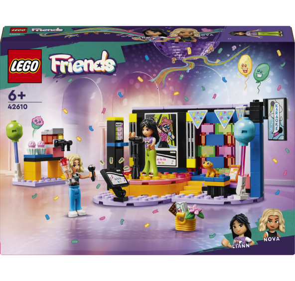• Uspořádejte karaoke párty – Stavebnice LEGO® Friends Karaoke párty pro děti od 6 let obsahuje 2 minipanenky, gekona, otáčecí pódium a spoustu doplňků• Otáčecí pódium – Ve stavebnici najdete otáčecí pódium, na kterém se při zpěvu střídají jednotlivé postavy na Liannině narozeninové oslavě• 2 minipanenky – Nechybí minipanenky LEGO® Friends Nova a Liann s tvářemi navíc a figurka gekona, takže dobrodružství může hned začít• Doplňky k vyprávění – Součástí stavebnice jsou mikrofony, nápoje, cupcaky, dárek, čokoláda, květiny, lístky a balónky• Skvělý nápad na dárek pro děti – Stavebnice představuje skvělá dárek k Vánocům pro děti, které milují zpěv a příběhy s hudbou• Stavebnice pro nápadité děti – Prohlédněte si další stavebnice z této řady (prodávají se samostatně) a inspirujte malé stavitele ke kreativním dobrodružstvím• Rozměry – Stavebnice se skládá ze 196 dílků a karaoke scéna měří přes 8 cm na výšku, 16 cm na šířku a 10 cm do hloubky