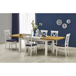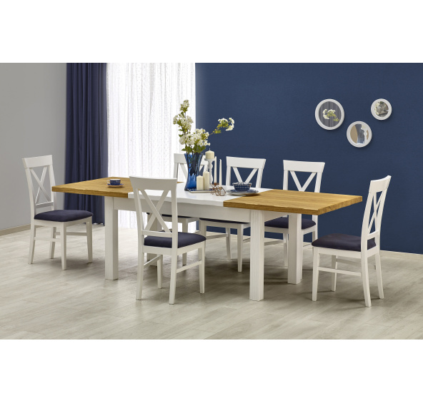 Popis produktu LEONARDO stół biały / dąb miodowy (1p=1szt)stół rozkładany, wymiary: 160-250/90/77 cm, materiał: płyta meblowa + okleina naturalna ( dębowa ) / MDF lakierowany, kolor: blat - dąb miodowy, nogi - białe