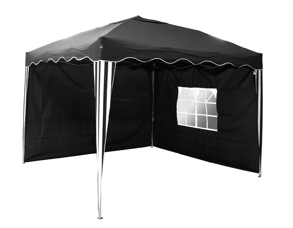Zahradní altán vybavený rychloskládající se nůžkovou konstrukci a dvěma bočními nepromokavými stěnami s jedním oknem.
