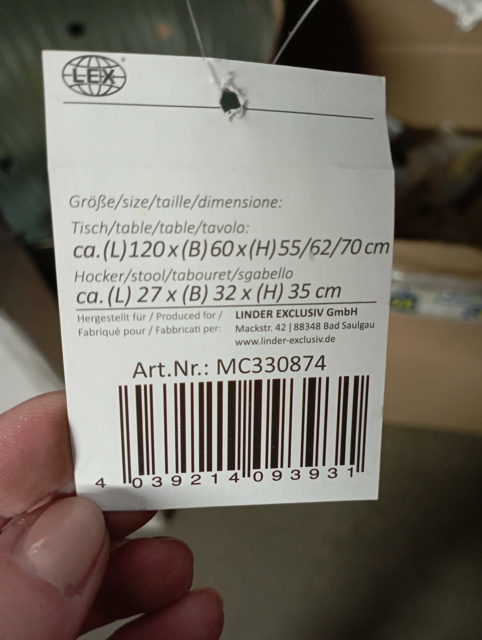 Popis produktu Linder Exclusiv Kempingový set MC330874Stůl má zrezivělé otavírací háčky a některé šroubky viz.foto Specifikace kempingového skládacího setu Linder Exclusiv MC330874. Vlastnosti a funkce: Vysoká kvalita a jednoduchý praktický design Výškově nastavitelný Pevná, hliniková konstrukce poskytuje stolu ideální stabilitu Uvedení do provozu je záležitostí několika vteřin Uzamykací mechanismus proti nechtěnému složení Židličky lze uložit do stolu Ve sbaleném stavu je stůl židle snadno přenosný v podobě ploché desky s uchem Nenáročnost na údržbu, snadné skladování Celoroční možnost využití Stůl nabízí dostatek prostoru pro 4 osoby Parametry: Materiál: Hliník, Oxford tkanina Rozměry stolu: 120 x 60 x 55/63/70 cm Rozměry židlí: 35 x 32 x 27 cm Hmotnost: 8 kg Záruka: 24 měsíců Kód produktu: MC330874 Výrobce: Linder Exclusiv Normy: Certifikát CE, vyhovuje směrnicím EU