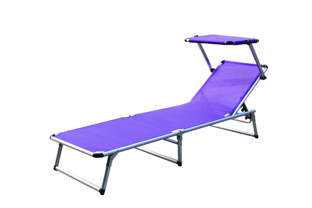 Skládací zahradní lehátko se stříškou a zpevněnou hliníkovou konstrukcí, v moderním designu, vhodné pro zahrady, na kempování či pláže.