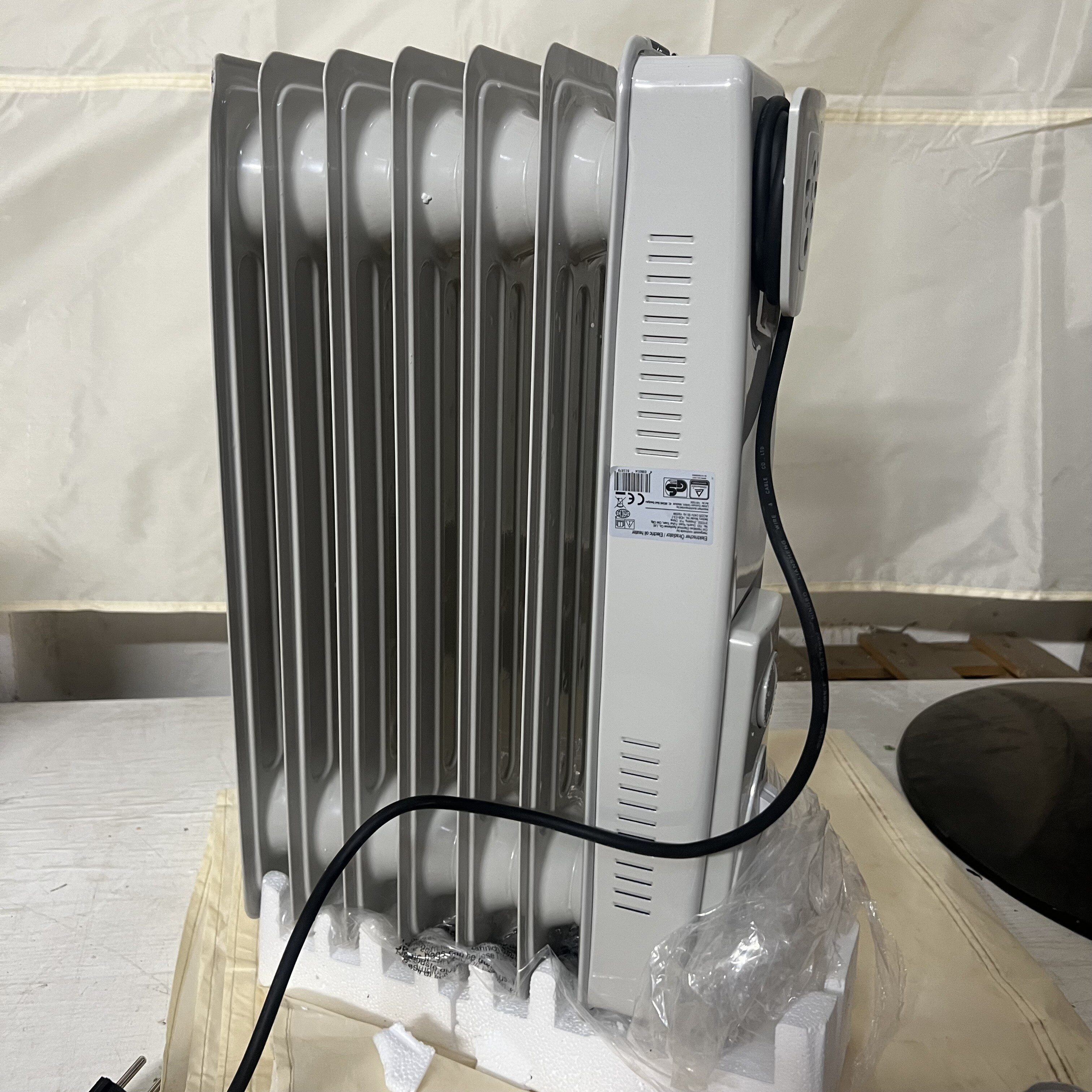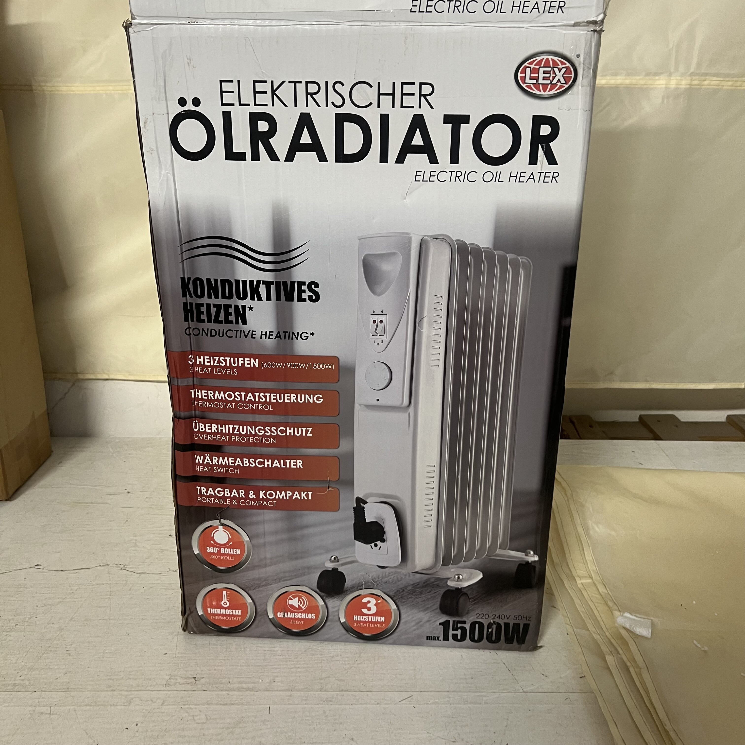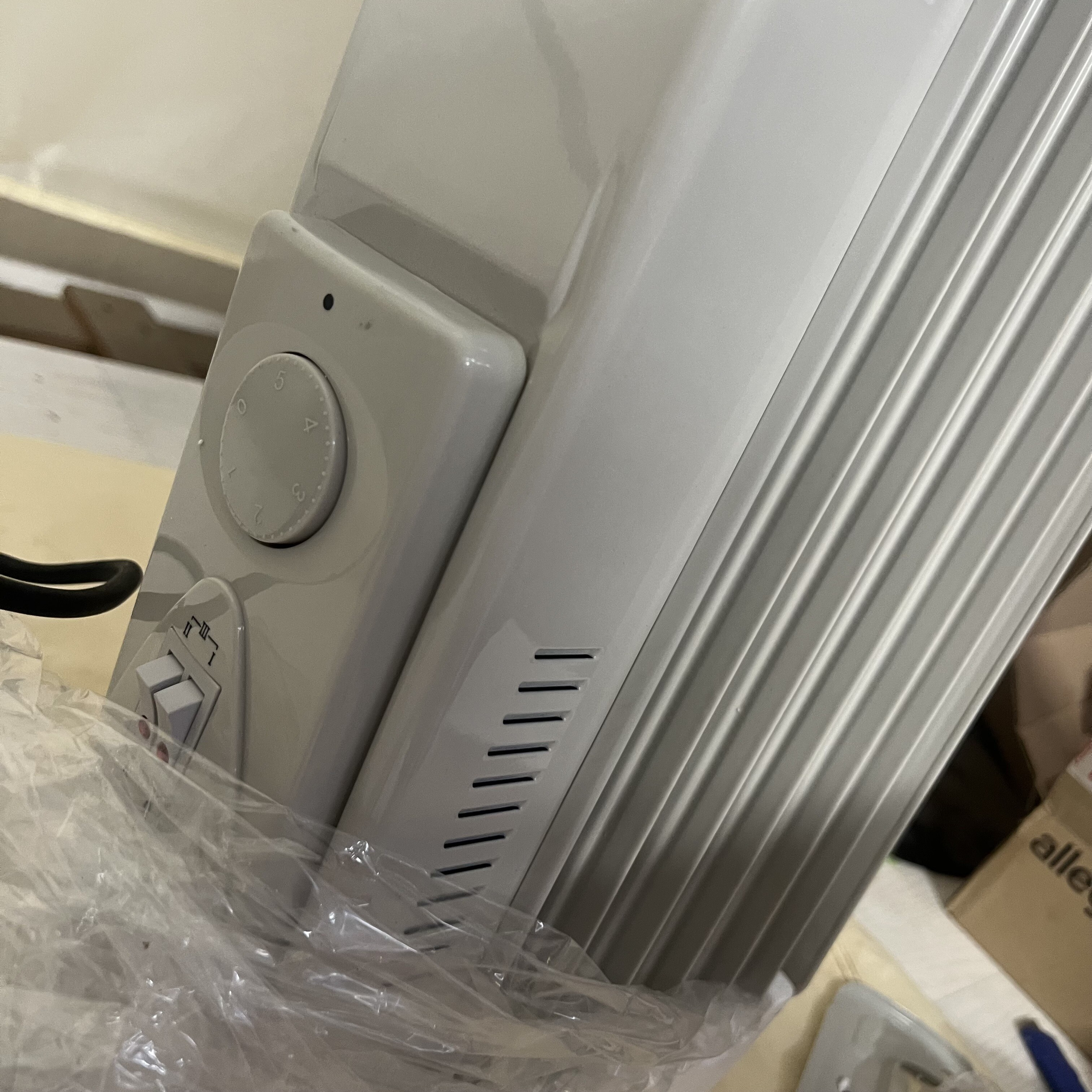 Radiátor má ohnuté jedno žebro elektrického ohřívače. Poškozený obal. Plně funkční.
