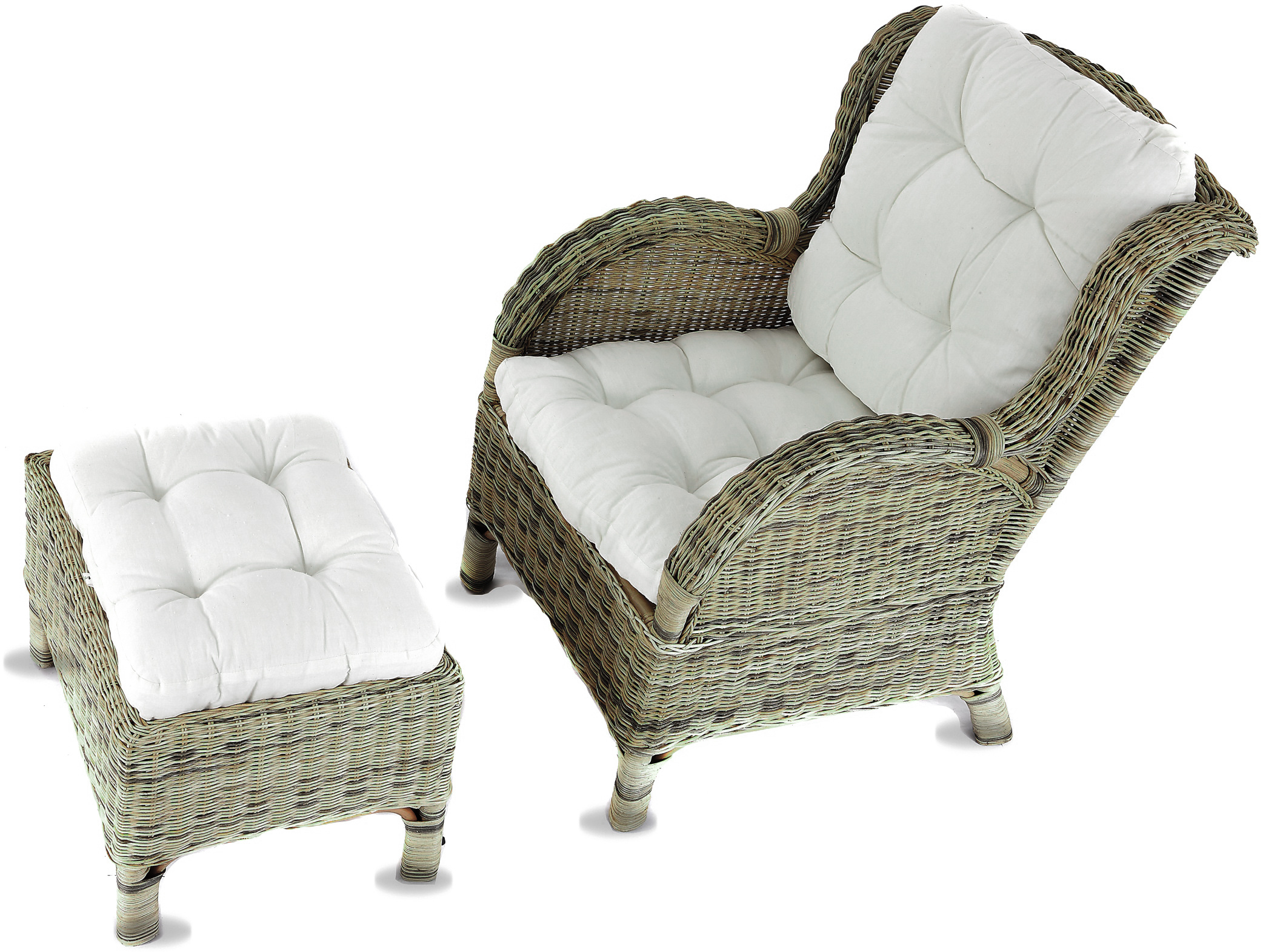 - Sestava obsahuje ratanové křeslo, ratanový taburet a kompletní sadu polstrů