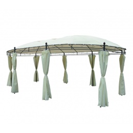 Zahradní altán vybavený pevnou a stabilní konstrukcí, v oválném provedení, se stahovatelnými závěsy.