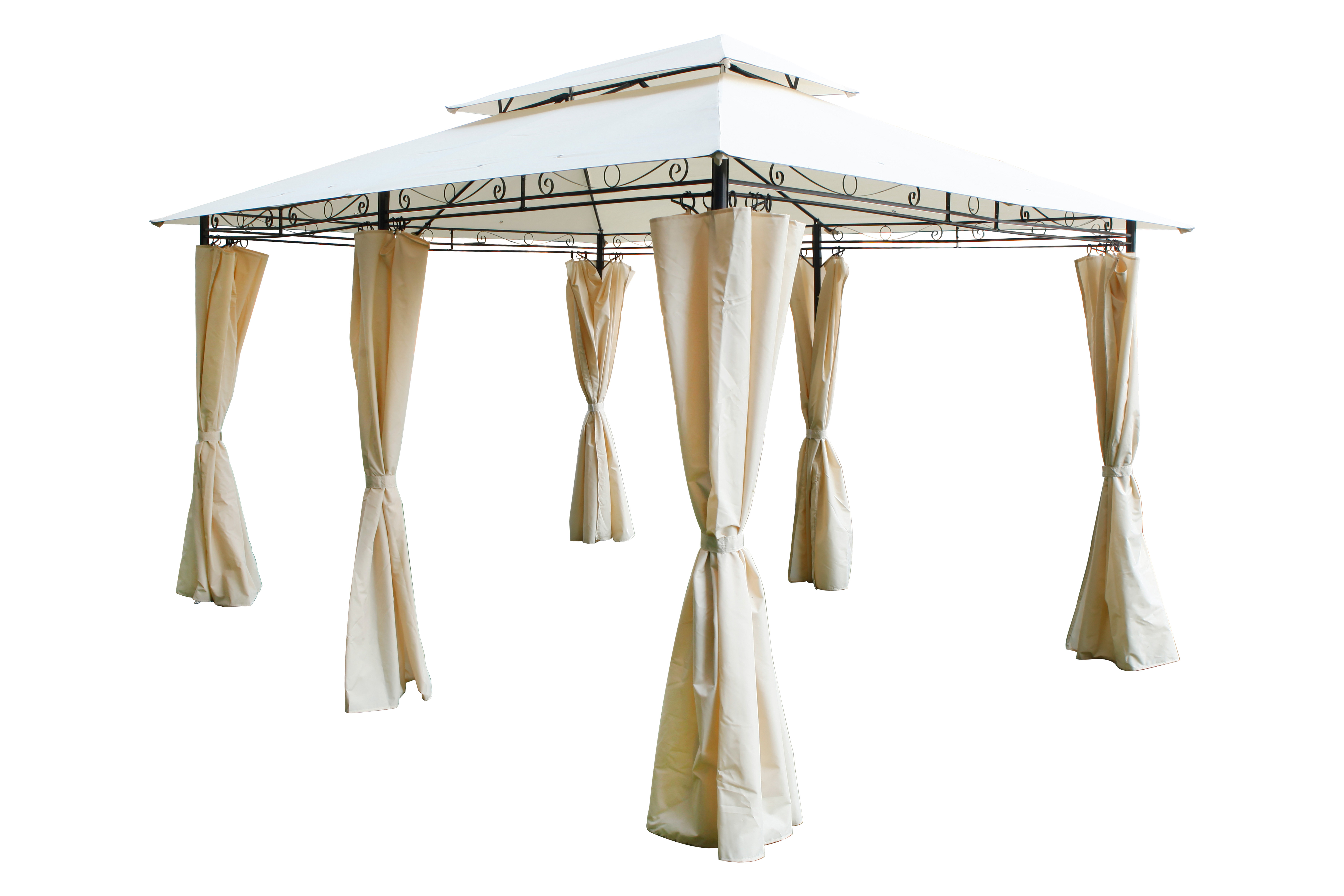 Zahradní altán s pevnou a stabilní konstrukci, v obdélníkovém provedení, se stahovatelnými závěsy.