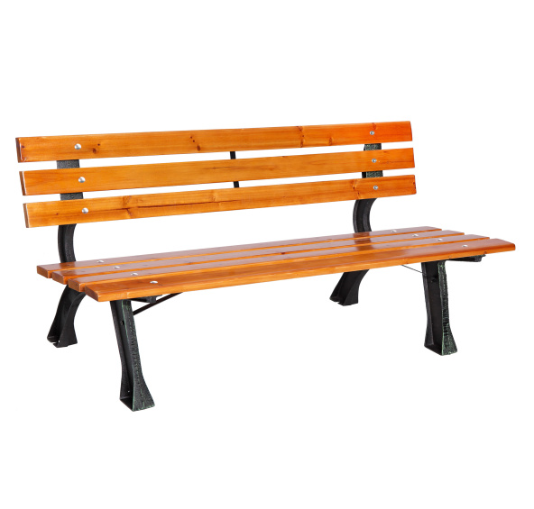 Lavička má poškrábaný rám a desky. Poškozený obal.