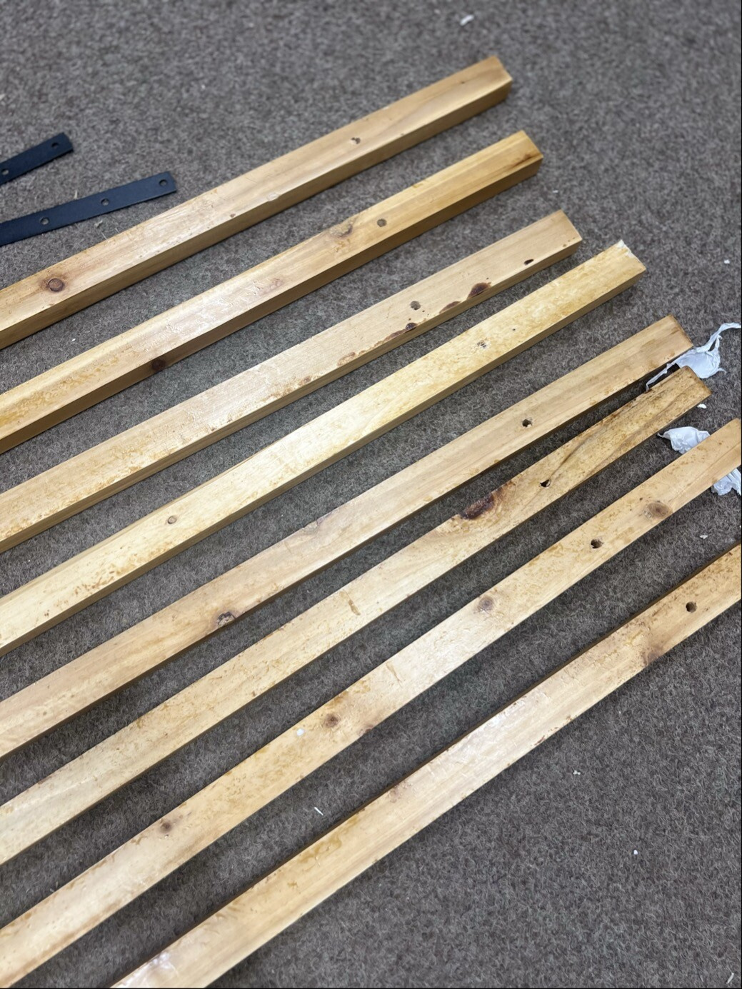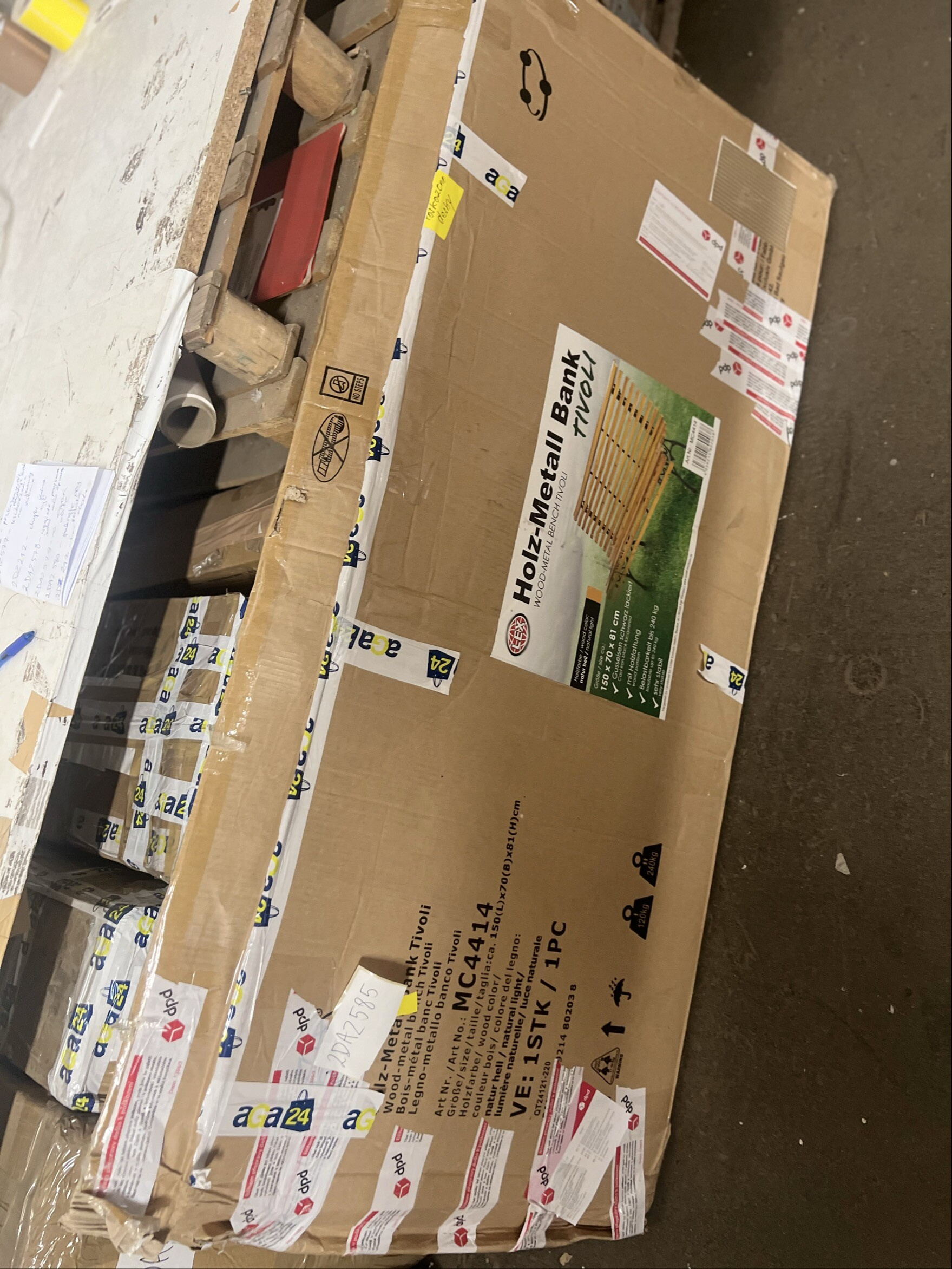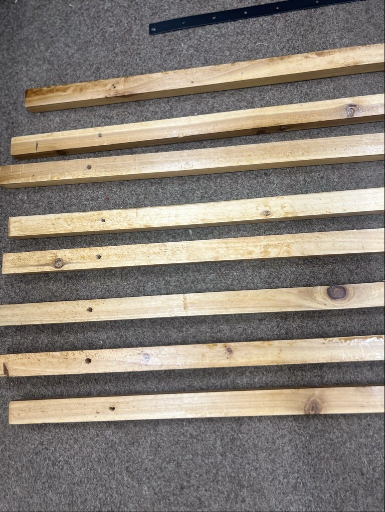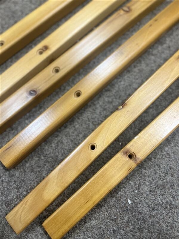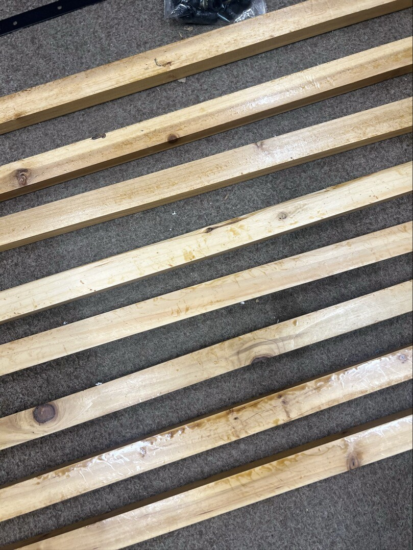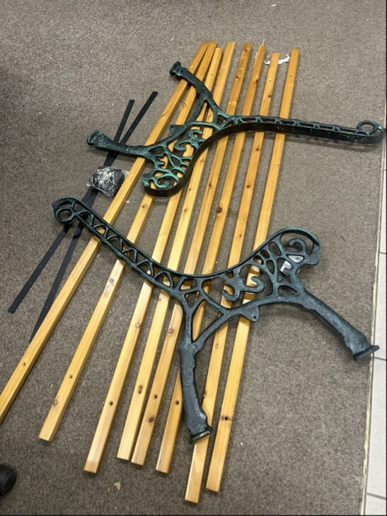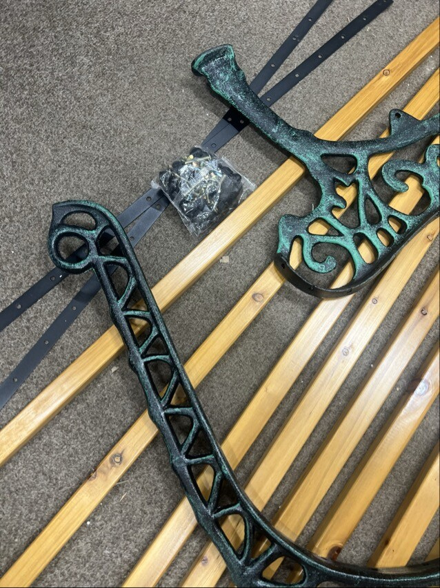 Lavice je plně funkční a kompletní. Vykazuje však drobné kosmetické vady – dřevěné desky mají lehké škrábance a obal je poškozený.