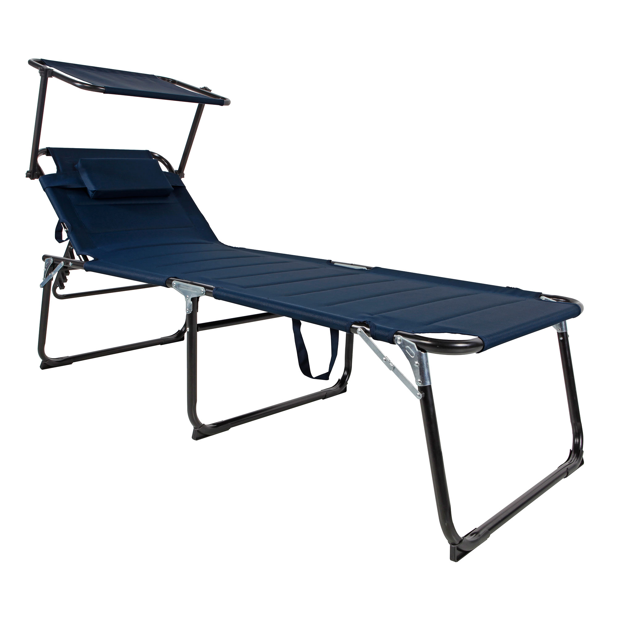 Skládací zahradní lehátko se stříškou a s polstrováním a zpevněnou hliníkovou konstrukcí, v moderním designu, vhodné pro zahrady, na kempování či pláže.