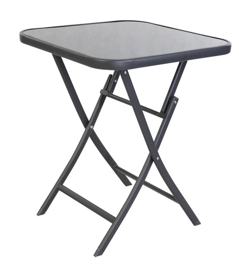 Skládací zahradní stolek s pevným kovovým rámem a skleněnou deskou, ideální pro zahrady, terasy, altány, balkóny, ale také do interiéru restaurací a kaváren.
