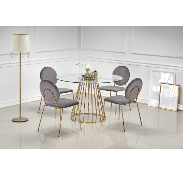 Popis produktu LIVERPOOL stół, blat - transparentny, nogi - złoty (2p=1szt)wymiary: o120/75 cm, materiał: szkło / stal chromowana, kolor: blat - transparentny, nogi - złoty