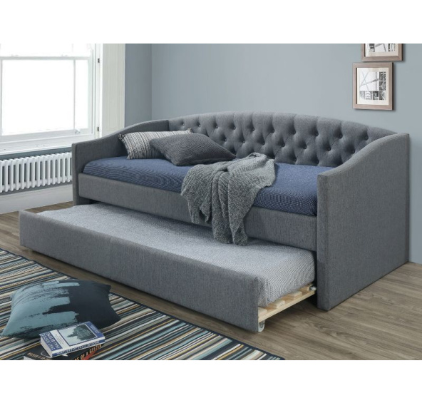 Rozkládací čalouněná pohovka Alessia, originálního vzhledu. Ve složeném stavu může plnit funkci pohovky a tak je vhodná také do obývacího pokoje či malých obytných prostor, kde rádi využijete možnost krásného stylového posezení přes den a pohodlného spaní pro dva na noc. Konstrukce je potažena látkou v šedé barvě. Rošty jsou součástí postele. Matrace nutno doobjednat.