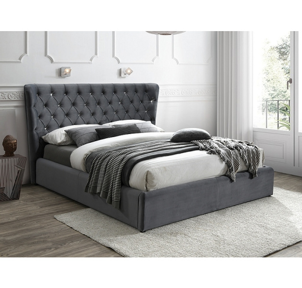 Postel, látka samet, barva: šedá, čal. Bluvel 14. Postel obsahuje v kompletu rošt z ohýbaných lamel osazených v pružných úchytech. Rozměr matrace 160x200 cm (cena bez matrace).