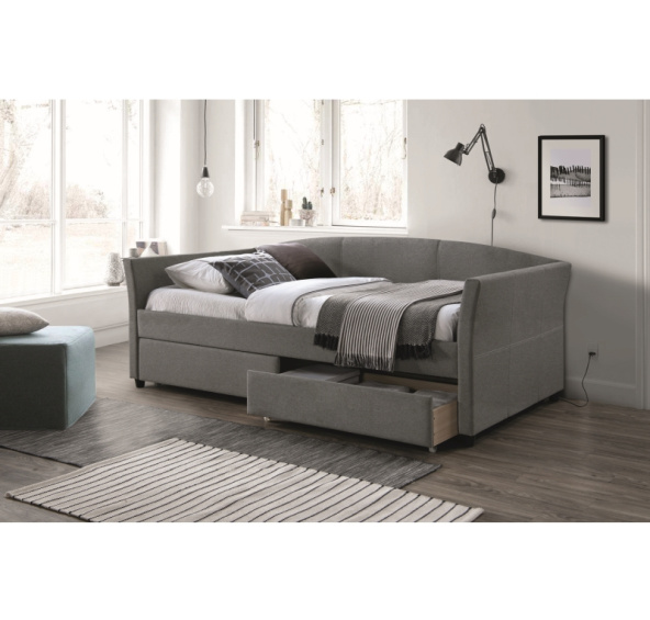 Jednolůžková postel zajistí pohodlný spánek, čalounění příjemnou látkou, konstrukce je vyrobena ze dřeva, 2 úložné prostory, vyvýšené čelo a opěrky.