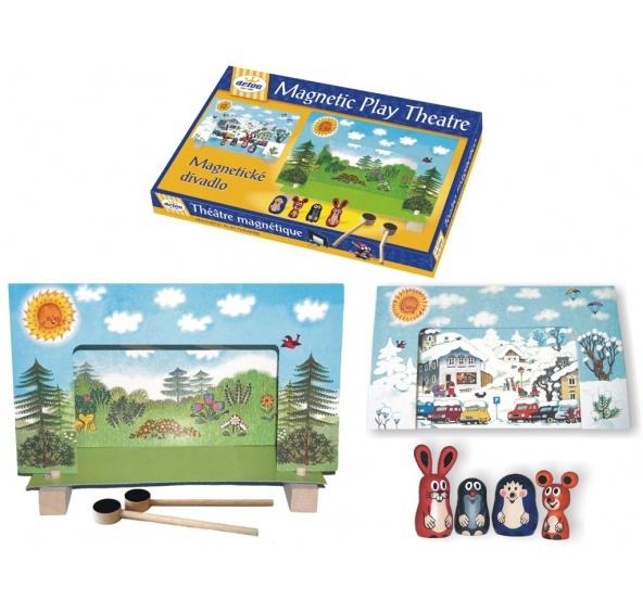 Dětské magnetické divadlo Krteček a jeho přátelé pro děti i dospělé. Zahrejte si divadlo s pohádkou o oblíbeném Krtečkovi a jeho kamarádech. Magnetické divadélko potěší a zabaví Vaše děti. Figurky se posunují po jevišti jakoby samy – za pomocí magnetických paliček, jenž se vsunou pod divadélko. Obsahuje čtyři postavičky – Krtečka, Myšku, Zajíčka a Ježka, kulisy – léto a zima, které lze libovolně měnit. Postavičky jsou ovládány zespod jeviště pomocí magnetů. Rozměry cca 34 cm x 21 cm x 4 cm. Divadélko je velmi kvalitně zpracované.