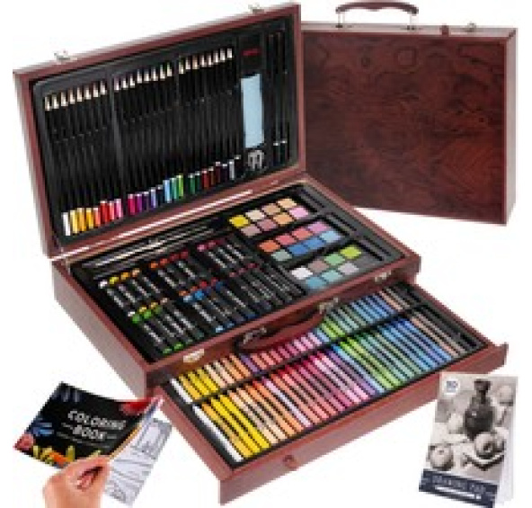 - HODNĚ PRVKŮ - malířská sada v kufříku má mnoho prvků, včetně: 60 voskovek, 24 pastelů, 24 dřevěných pastelek, 24 vodou ředitelných barev, dále 2 štětce, ořezávátko, 2 ks brusného papíru, gumu, dvě tužky HB a 2B .