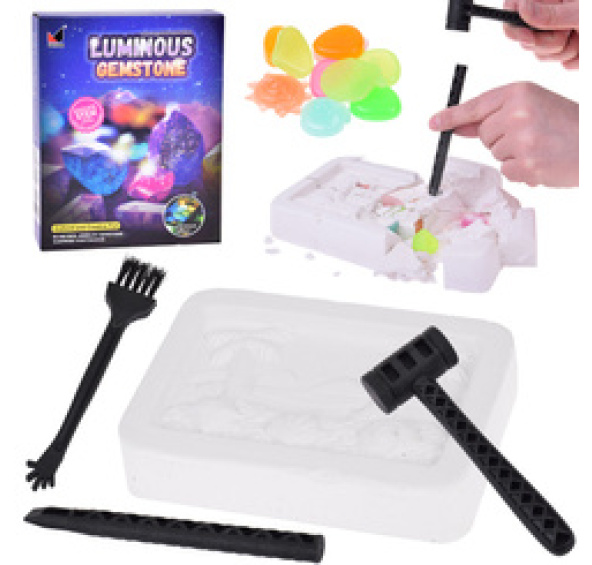 Inspirační hračka pro každé dítě, které by se v budoucnu chtělo stát archeologem nebo hledačem pokladů. Hračka v atraktivní formě představuje simulaci vykopávek a jistě zabaví dítě na delší dobu. Úkolem dítěte je pomocí kladívka a dláta objevit další ukryté poklady v sádrovém odlitku. Ačkoli je zábava pracná, odměňuje nás mnoha krásnými kameny, které jsou navíc fluorescenční - po osvětlení (slunečním nebo umělým světlem) budou svítit ve tmě, vytvářejíc úžasný vizuální efekt.