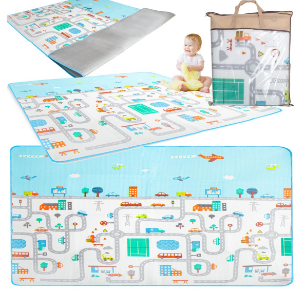 Popis produktu Aga Vzdělávací pěnová podložka pro děti Street 180x200cm Velká jednostranná pěnová hrací podložka se vzorem města. Skvěle se hodí jako koberec do dětského pokoje. Podložka izoluje od chladu a tlumí pády. Vaše dítě si bude moci bezpečně hrát na podlaze. Ideální pro učení plazení a chůze. Protiskluzová konstrukce zajišťuje bezpečnost dítěte při jeho prvních krůčcích. Podložka má pod sebou vrstvu tepelně izolační fólie, takže si ji můžete vzít na zahradu nebo na pláž. Je to skvělý doplněk do dětského pokoje, který zpestří hraní každého batolete. Odolná vůči nečistotám Snadno se čistí pouhým otřením vlhkým hadříkem. Baleno v praktické tašce se zipem pro snadnou přepravu. Výhody Velká velikost podložky: 180 x 200 cm Jasné tlumené barvy Izolační funkce Chrání dítě před zraněním při pádu Užitečné při učení chůze a plazení Lehké Snadné čištění Protiskluzová struktura Žádné věkové omezení Baleno v praktické přenosné tašce se zipovým uzávěrem. Parametry Rozměry: 1,8 x 2 m Tloušťka rohože: 4 mm Rozměry balení: 64 x 42 x 8 cm