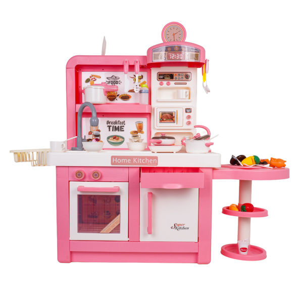 Interaktivní, bohatě vybavená kuchyně se zvukovými, světelnými a parními efekty pro děti od tří let. Všechny prvky sady jsou vyrobeny z nejkvalitnějších materiálů bezpečných pro děti. Kuchyně je laděna v růžovo-bílé tónině, bude se hodit do každého dětského pokoje. Hračka kuchyně obsahuje mikrovlnnou troubu, dřez s kohoutkem, indukční varnou desku, troubu, kávovar, lednici, stojan na dezerty a spoustu kuchyňských doplňků, jako jsou hrnce, příbory, talíře, konvice, hrnečky a atrapy potravin. Z kohoutku opravdu teče voda, indukční vařič je podsvícený, má displej teploty a vydává realistické zvuky vaření a smažení. Další atrakcí kuchyně je bezpečná (chladná) pára vycházející z jednoho z hrnců. Kohoutek je napájen bateriemi typu 2 x 1,5V AA (nejsou součástí balení), indukční deska bateriemi 3 x 1,5V AAA (baterie nejsou součástí balení).