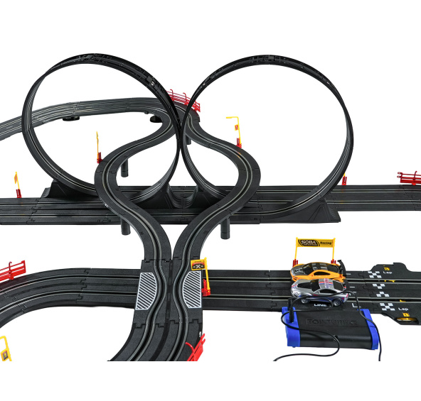 Velká závodní dráha se dvěma dálkově ovládanými autíčky v sadě, pro děti od 8 let. Tato sada umožňuje sestavit dráhu se dvěma smyčkami, ostrými zatáčkami a rovnými úseky. Je vybaven dvěma autíčky a dvěma ovladači ve tvaru volantu. Hračka má světelné efekty (světla ve vozidlech) a zvukové efekty (zvuky zrychlení a zvuky motoru). Tunel je napájen pomocí adaptéru 12V (v balení) nebo bateriemi typu 8 x AA 1,5V (nejsou součástí balení). Piloty mohou být připojeny k dráze nebo napájeny bateriemi 2 x AAA 1,5V (nejsou součástí balení).