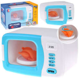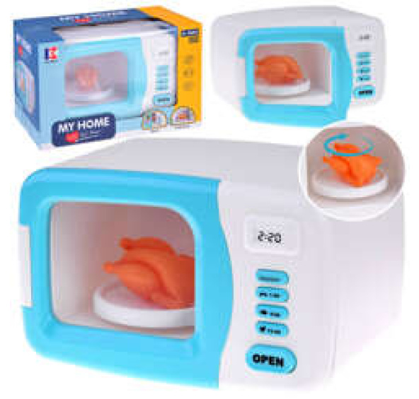 Mikrovlnná trouba je nezbytnou součástí vybavení kuchyně každé malé hospodyňky. Děti rády vaří nejrůznější jídla pro své plyšáky a panenky, takže tato mikrovlnná trouba jistě potěší každého malého kuchaře. Mikrovlnná trouba má vypínač, po jehož stisknutí se zařízení aktivuje a začne ohřívat jídlo. V mikrovlnné troubě je kuře, které se po aktivaci trouby otáčí na otočném talíři. Během zapínání je střed sporáku osvětlen červeným světlem . tlačítko ON/OFF slouží k zapnutí a zastavení mikrovlnné trouby, zatímco tlačítko OPEN slouží k otevření dvířek. Hračka rozvíjí dětskou představivost a podporuje zájem o vaření, přípravu jídla a učí je pomáhat ostatním při domácích pracích.