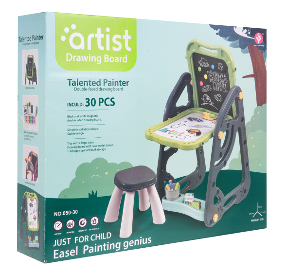 Velká multifunkční sada skládající se ze dvou tabulí: křídové a magnetické, a židle je určena pro děti od 3 let. Stojan na tabule lze nastavit ve dvou variantách. V první variantě budeme mít na jedné straně magnetickou tabuli a na druhé křídovou tabuli. Můžeme také nastavit výšku desek. Ve druhé variantě budeme mít stůl, na jehož horní a přilehlé stěně budou dvě desky. Na bílou stranu lze psát fixami nebo na ni lze připevnit barevné magnety. Černou stranu lze namalovat křídou a lze na ni také připevnit barevné magnety.
