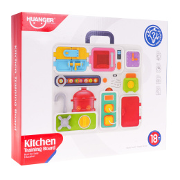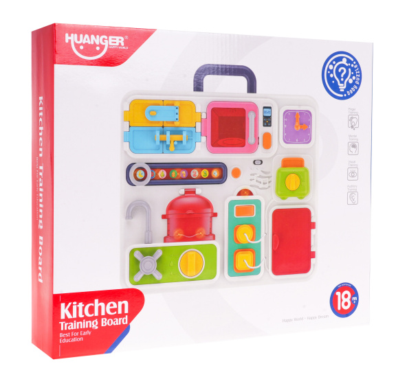 | Multifunkční interaktivní tabule se zvukovými a světelnými efekty pro batolata od 18 měsíců. Má spoustu pohyblivých částí, které lze otevírat, otáčet a nasazovat, a zlepšuje tak motorické dovednosti. V horní části je praktická rukojeť pro přenášení nebo opření panelu. Hračka je napájena 3 bateriemi 1,5 V, baterie nejsou součástí balení. Prvky panelu: - uzamykatelná skříňka, - skříňka se západkou, - mikrovlnná trouba s otevíráním dvířek tlačítkem, zvukem otevírání a světlem uvnitř, - hodiny s pohyblivými ručičkami vydávajícími mechanické zvuky, - panel se zvuky, blikajícími světly, posuvníkem a prokládacím kolečkem, - tlačítko, které aktivuje zvukové efekty, různé melodie a blikající světla na panelu s posuvníkem, - tlačítko pro nastavení hlasitosti nebo vypnutí zvukových efektů, - topinkovač s voličem a výsuvným topinkovačem, - kohoutek s kohoutkem, který spustí zvuk tekoucí vody a blikající světla na panelu posuvníku, - otevírací nádoba, do které můžeme vložit vyjímatelné předměty, jako je salát, brokolice, rajčata, ryby a kuřecí maso, - po otočení hořáku jsou slyšet zvuky vaření a smažení a uvnitř hrnce svítí světla, - kontakt pro chladničku a toustovač, po správném zasunutí zástrček do zásuvek se ozve zvuk, - otevírací lednice se světlem uvnitř. | |