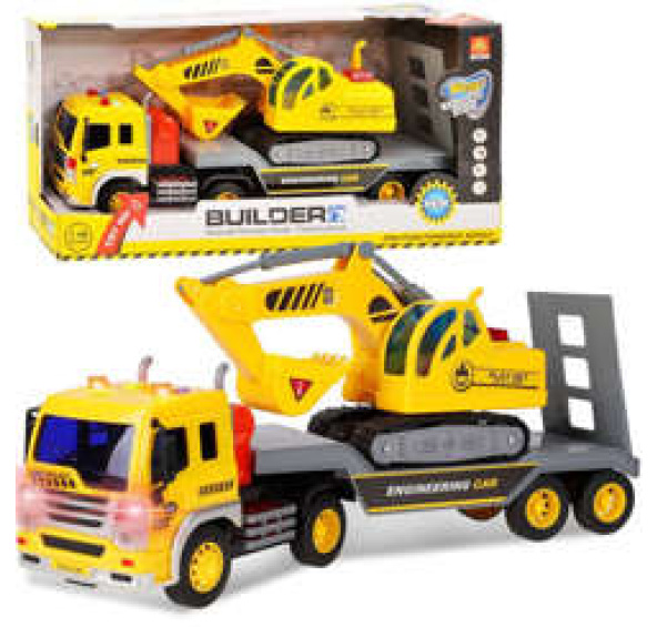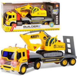Senzační sada pro malé řidiče stavebních strojů Nákladní auto s přívěsem pro přepravu bagru potěší každého malého řidiče. Na střeše náklaďáku jsou tlačítka se zvukovými a světelnými efekty, která umožňují hrát si s těmito vozidly. Rypadlo má pohyblivou lžíci a korbu, takže se s ním snadno pracuje.
