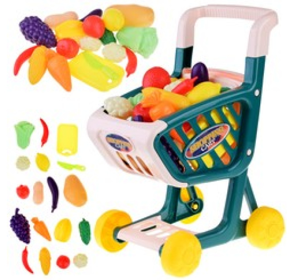 Velký nákupní vozík plný ovoce a zeleniny je ideální pro hru na obchod. Děti rády napodobují dospělé při každodenních činnostech, takže tento super vozík na zeleninu se bude líbit každému batoleti. Kočárek je vyroben výhradně z plastu, má široká kola a pohodlnou rukojeť pro řízení. Zelenina/ovoce jsou navíc plastové v atraktivních barvách.