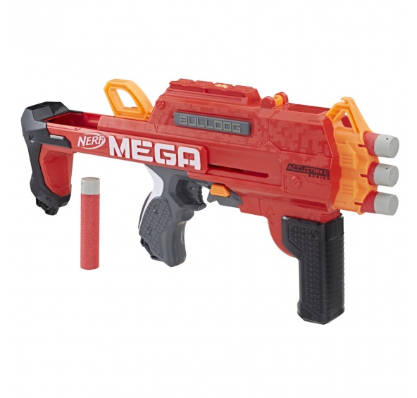 Pohněte s rukojetí a měňte režimy jedním rychlým a snadným krokem! Otočte páčku dolů, aby se automaticky vysunul zásobník a vztyčte zaměřovač. Otočte upínací páčku nahoru tak, aby se automaticky zasunul zásobník a snížil se zaměřovač. Bláster Nerf Mega Bulldog je součástí řady AccuStrike, která je vybavena šipkami navrženými pro větší přesnost. Nabijte 3 šipky do předního zásobníku, zatáhněte za rukojeť a spusťte spoušť. Uložte 3 šipky do připojeného držáku. Obsahuje 6 Mega šipky AccuStrike Nerf.