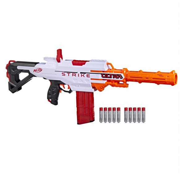 Blástr Nerf Ultra Strike se dodává se zásobníkem na 10 Accustrike nábojů a integrovaným zaměřovačem. Zapojte se do bitvy s tímto motorizovaným blástrem a užijte si nefalšovanou zábavu!