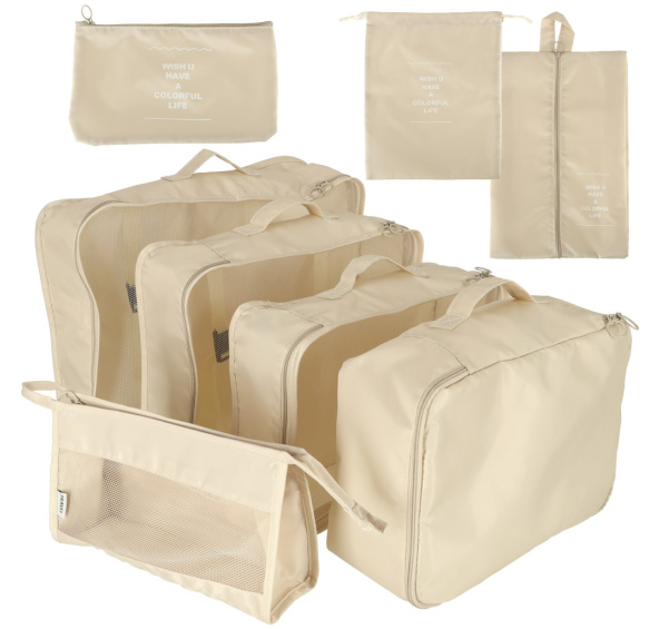 Praktické organizéry do kufru - nepostradatelné na každé cestě! Výrazně vám usnadní udržování pořádku v zavazadle. Sada obsahuje 8 organizérů různých velikostí - jsou zde čtyři kostky na oblečení, taška, organizér na boty, taštička na make-up a malá kapsička na drobnosti. Všechny předměty v sadě mají béžovou barvu.
