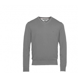 Tento svetr má klasický střih s žebrovaným V-výstřihem, dlouhé rukávy také s žebrovanými manžetami a nenápadnou výšivku loga Tommy Hilfiger vpředu na hrudi.