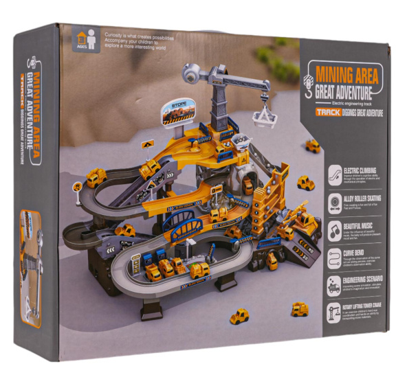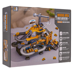 Sada parkoviště, staveniště s jeřábem a stavebními autíčky pro děti od 3 let. Byl vyroben z nejkvalitnějšího plastu v živých barvách. V této sadě najdeme mnoho atrakcí, jako je garáž, parkoviště, jeřáb, stanice. Elektrická páska vytahuje vozidla na trať nahoru a doprovázejí to příjemné zvuky. V této sadě máme četné zatáčky, vjezdy, závory a tunely, není možné se nudit. Je zde také žlab na kameny, který transportuje kameny do speciálního kontejneru. Další stroj umístěný u okapu překládá kameny do autíček, aby je odvezly až nahoru.Zestava je napájena bateriemi typu 3 x AA 1,5 V (nejsou součástí balení).