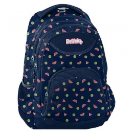 Má tři prostorné přihrádky, přední kapsu na zip s organizérem a dvě boční kapsy ze síťoviny a látky na láhev nebo termosku.