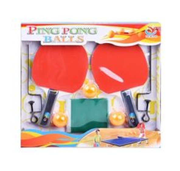 Dřevěné palety s míčky a sítí, pingpongová sada určená pro 2 hráče. Celá sada se skládá ze 2 raket, 3 míčků, síťky na stůl a 2 kovových držáků na připevnění síťky. Jedna strana rakety je z hladké gumy, zatímco druhá je gumová a drsná.