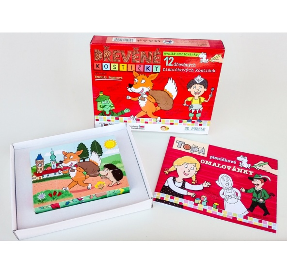 Písničkové kostičky – 6 kostiček pro nejmenší – balení kostiček totiž navíc obsahuje krásné omalovánky od Venduly Hegerové a texty lidových písniček, které jsou vyobrazeny na kostičkách.