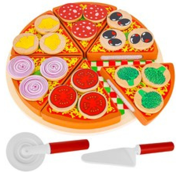 - V ceně - sada obsahuje až 27 prvků: stojánek, 6 kusů pizzy, stěrku, nůž na dělení těsta a 3 kusy ananasu, cibule, rajčat, brokolice, oliv a salámu. Celé je vyrobeno z kvalitního dřeva a natřeno speciální zdravotně nezávadnou barvou . Navíc má suchý zip , který vám umožní pizzu nakrájet a po hraní zase složit .