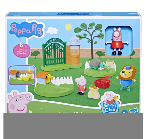 Vydejte se na předstíraný jednodenní výlet se sadou Peppův den v Zoo! Tato hračka pro předškoláky je dodávána s 3palcovými figurkami milovaných postaviček inspirovaných televizním pořadem prasátko Peppa – samotným Peppou a panem Lionem, ošetřovatelem Zoo! Postavte figurky pomocí 6 doplňků s tématikou zoo, včetně velkého pozadí vstupu do Zoo s branami, které se otevírají a zavírají! Malé děti mohou umístit sáčky s předstíraným krmením pro zvířata do vagónu a představit si, že krmí malou kachnu a želvu. Umístěte sáčky s krmením na interaktivní body zvířecích stanic, aby se zvířata pohybovala! Předškoláci budou rádi předstírat, že jsou na výletě v Zoo nebo si vymýšlet momenty z příběhů prasátka Peppy.