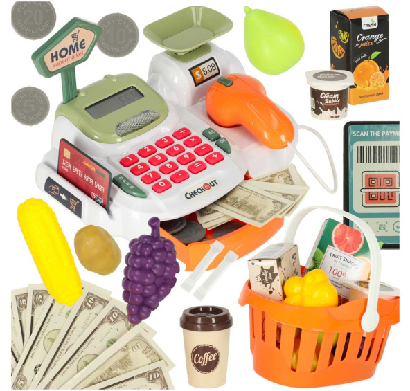 S přiloženými hracími doplňky získá dítě nejen pokladnu, ale celý "sortiment" pro vedení obchodu. Sada obsahuje mj: