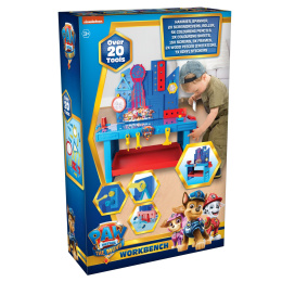 Pracovní stůl kutili Tlapková Patrola s 20 nástroji! Balení obsahuje – stůl s velkou pracovní ploucho a zády, šroubovák, kladívko, klíč, 2 válečky, 5 pastelek, 3 omalovánky, 10 šroubů, 2 ks dřeva a 5 samolepek. Rozměr stolu je 46×32×78 cm.