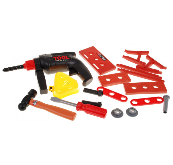 | | - akumulátorová vrtačka s příklepem, - plochý šroubovák, - kladivo, - 2 matice, - hmoždinka , - 2 šrouby, - 2 podpěry stojanu, - 2 konektory stojanu, - 2 červené konektory s otvory, - 3 hnědé konektory s otvory, - maska s gumičkou, - praktický kufřík, Hračka na baterie - 2 x 1.5 V "AA" - není součástí dodávky. |
