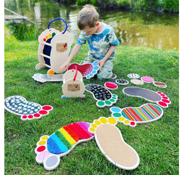 Souprava smyslových stop a kruhů může nalézt široké uplatnění, zejména při výuce a výchově předškolních dětí, dětí s poruchami zraku, nebo i terapii. Stopy jsou navrženy a vyráběny s důrazem na každodenní použití, mohou proto nabídnout robustní a odolné zpracování. Každá je ve dvojici s příslušným kruhem opatřena odlišným plastickým povrchem, čehož lze snadno využít při nejrůznějších hrách napomáhajících rozvíjení hmatu. Díky barevnosti je však můžete kreativně využít i k mnoha jiným činnostem, při kterých budou zároveň poutavě dekorovat prostor. Souprava je opatřena pevnými a stabilními dřevěnými pořadači, díky kterým ji lze snadno uskladnit. Pro snadné přenášení je navíc vybavena také atraktivními a odolnými brašnami. Sada I obsahuje povrchy tvořené plstí, silikonovou pěnou, umělou trávou, kovovými kroužky zapuštěnými do pryskyřice, perlami zapuštěnými do pryskyřice, barevnými křemeny, vlnitou gumou, pěnovým kaučukem, akrylátem a umělou kožešinou. Hlavní vlastnosti:10 stop a 10 kruhů s různými povrchy, 2 pořadače a 2 brašnyširoké uplatnění při hrách, výuce a terapiiatraktivní a odolné zpracovánívyrobeno v EU Srovnání a vyobrazení obsahu jednotlivých řad Smyslových stop:
