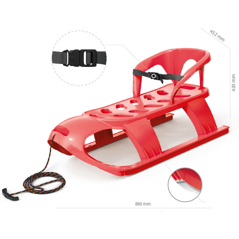 Sáně jsou vyrobené z vysoce odolného plastu a opatřené ocelovými skluznicemi, které zajišťují perfektní skluz po sněhu. Sáňky jsou vybaveny bezpečnostním pásem s přezkou, který dítěti zajistí ochranu proti pádu.