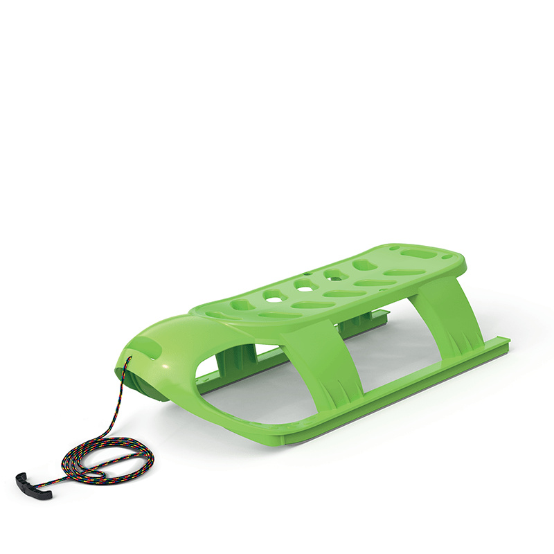 Sáně jsou vyrobené z vysoce odolného plastu a opatřené ocelovými skluznicemi, které zajišťují perfektní skluz po sněhu.