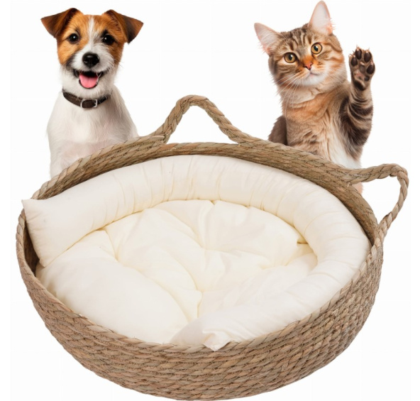 Měkký, vestavěný polštář zajišťuje mazlíčkovi pohodlí, a zakrytí stěn košíku způsobuje, že v každé pozici mu bude příjemně.Košík je vybaven držadlem ve tvaru kočičích oušek, což je praktické řešení - usnadňuje přenášení.Navíc ouška vypadají roztomile, pěkně zdobí místnost, ve které se pelíšek nachází. Proutí jako materiál je ekologické a díky své struktuře zajišťuje dobrou cirkulaci vzduchu. Pro bezpečnost čtyřnohého mazlíčka nemá košík žádné ostré hrany a materiál je velmi odolný.Kulatý tvar obklopuje zvíře ze všech stran, což umožňuje odpočinek a plnou relaxaci na mnoho hodin.