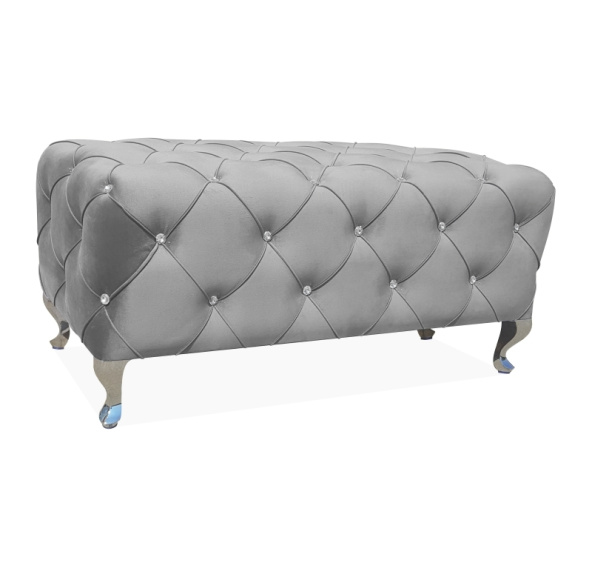 Puf / lavice, látka samet: šedá BLUVEL 14 / nohy: kov, barva: stříbrná. Množství krystalků (knoflíků): 54 ks., výška nožek: 14 cm