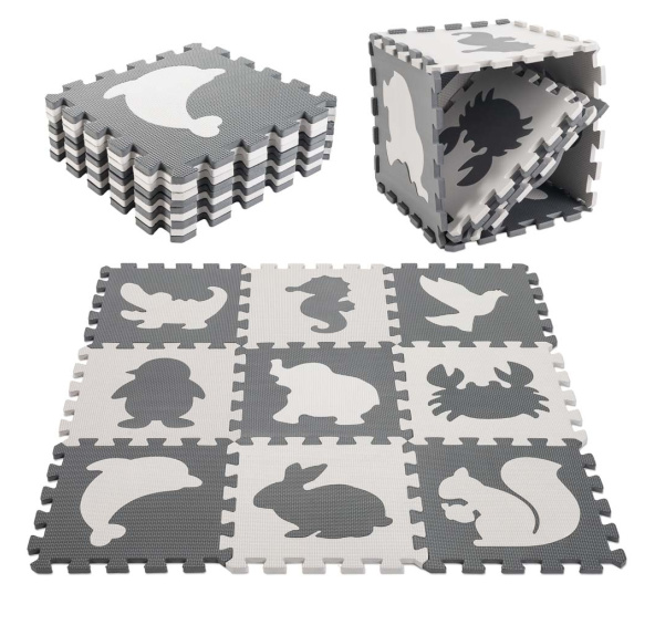 Kontrastní pěnové puzzle s obrázky zvířat a tvarů. Nejen že rozvinou zrak a motoriku miminka, ale postavit z nich můžete také ohrádku, a tím vytvořit bezpečný prostor k hraní.