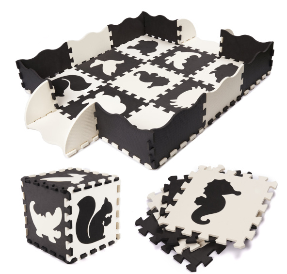 Kontrastní pěnové puzzle s obrázky zvířat a tvarů. Nejen že rozvinou zrak a motoriku miminka, ale postavit z nich můžete také ohrádku, a tím vytvořit bezpečný prostor k hraní.