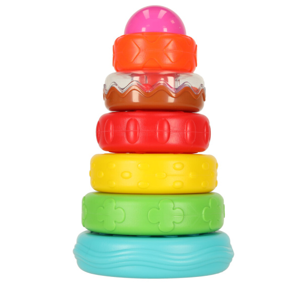 Sedm velkých bloků lze skládat na sebe a vytvořit tak působivou pyramidu! Každý kus má jinou barvu a jinou strukturu. Jeden z bloků má navíc kuličky, které jsou vidět skrz průhlednou horní část.